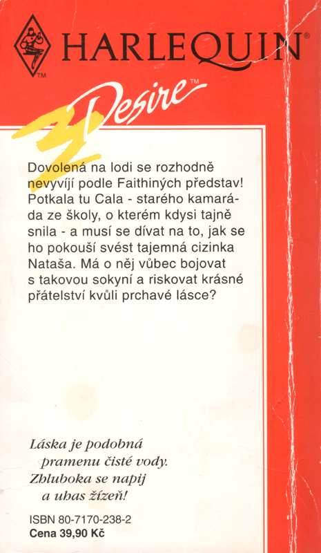 Harlequin Desire č. 109 K 01/95 | Dovolená na lodi se rozhodně nevyvíjí podle Faithiných představ! Potkala tu Cala - starého kamaráda ze školy, o kterém kdysi tajně snila - a musí se dívat na to, jak se ho pokouší svést tajemná cizinka Nataša. Má o něj vůbec bojovat s takovou sokyní a riskovat krásné přátelství kvůli prchavé lásce?