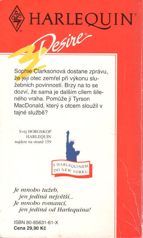 Harlequin Desire č. 29 K 05/93 | Sophie Clarksonová dostane zprávu, že její otec zemřel při výkonu služebních povinností. Brzy na to se dozví, že sama je dalším cílem šíleného vraha. Pomůže jí Tyrson MacDonald, který s otcem sloužil v tajné službě?