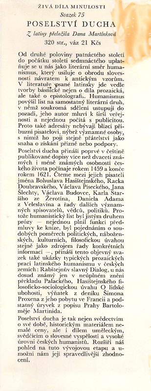 Od druhé poloviny patnáctého století do počátku století sedmnáctého uplatňuje se u nás jako literární směr humanismus, který usiluje o obrodu slovesnosti návratem k antickým vzorům. V literatuře psané latinsky jde vedle tvorby básnické nejen o díla prozaická, ale také o epistolografii. Humanismus povýšil list na samostatný literární druh, v němž soukromá sdělení ustupují do pozadí, jeho autor mluví k širší veřejnosti a nejednou počítá s publicitou. Proto také adresáty nebývají blízcí příbuzní pisatelovi, nýbrž významné osoby, s nimiž ho pojí stejně přátelství jako snaha o získání přízně nebo podpory. Poselství ducha přináší poprvé v češtině publikované dopisy více než dvaceti známých i méně známých osobností českého života počínaje rokem 1459 a konče rokem 1621. Čteme mezi jejich pisateli jména Bohuslava Hasištejnského, Racka Doubravského, Václava Píseckého, Jana Šlechty, Václava Budovce, Karla Staršího ze Žerotína, Daniela Adama z Veleslavína a řady dalších významných spisovatelů, vědců, politiků. Protože humanistický list byl jistým druhem prózy - nejednou plnil funkci předmluvy ke knize, byl pojednáním o soudobých poměrech politických, náboženských, kulturních, filosofickou úvahou stejně jako zdrojem řady konkrétních informací, přináší tento objevný svazek také ukázky typických prozaických prací latinského humanismu v českých zemích: Rabštejnův slavný Dialog, u nás dosud známý jen v neúplném znění překladu Palackého, Hasištejnského filosoficko-sociologickou úvahu O lidské ubohosti, výňatek z deníku Šimona Proxena z jeho pobytu ve Francii a podstatný úryvek z popisu Prahy Bartoloměje Martinida.