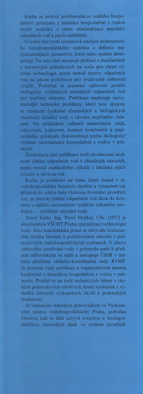 Autor knihy Ing. Pavel Dočkal, CSc. (1937) je absolventem VŠCHT Praha, specializace technologie vody. Jeho kandidátská práce se zabývala hodnocením účinku biocidů a potlačováním nárostů v průmyslových vodohospodářských systémech. V oboru opětového používání vody v průmyslu patří k předním odborníkům ve státě a zastupuje ČSSR v jednání příslušné vědecko-koordinační rady RVHP. Je autorem řady publikací a organizátorem mnoha konferencí s tématikou hospodaření s vodou v průmyslu. Podílel se na řadě technických řešení v různých průmyslových odvětvích, která vycházela z výsledků řešených výzkumných úkolů a praktických zkušeností. Je vedoucím vědeckým pracovníkem ve Výzkumném ústavu vodohospodářském Praha, pobočka Ostrava, kde se dále zabývá toxicitou a biodegradabilitou cizorodých látek ve vodním prostředí.