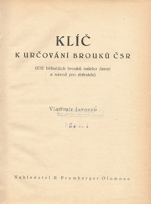 Klíč běžnějších brouků našeho území a návod pro sběratele. V prvé části klade autor váhu na Terminologii broučího těla. Text i obrázky seznamují začátečníka s broučkařskou "násobilkou", bez níž je určování nemožné. V Pokynech pro sběratele jsou uvedeny hlavně zkušenosti doc. dr. J. Obenbergera. Samotný klíč obsahuje naše běžnější druhy a text je opřen o Reitterovu Faunu Germanicu a Karnyho Käfer.