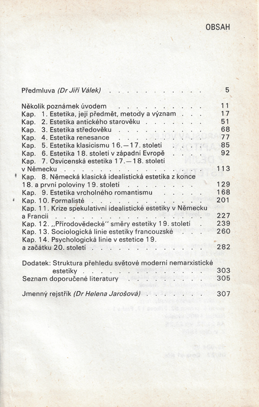 "Kapitoly z dějin estetiky" podávají formou učebního textu jakýsi stručný a výběrový přehled dějin estetiky, zatím - v tomto svazku - časově vymezený zhruba rozmezím od nejstarších estetických názorů až po 19. století, v některých částech až do prvních desetiletí 20. století.