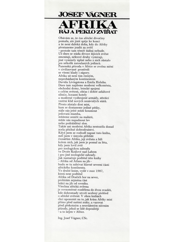 Když jsem se rozhodl napsat tuto knihu, měl jsem v úmyslu přiblížit čtenářům Afriku, její zvířata a lidi kolem nich, jak jsem je poznal za léta, kdy jsem lovil zvěř pro zoologickou zahradu ve Dvoře Králové nad Labem i pro jiné zoologické zahrady.