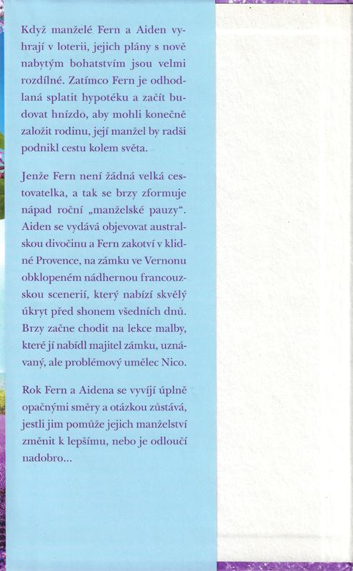 Jenže Fern není žádná velká cestovatelka, a tak se brzy zformuje nápad roční „manželské pauzy “. Aiden se vydává objevovat australskou divočinu a Fern zakotví v klidné Provence, na zámku ve Vernonu obklopeném nádhernou francouzskou scenerií, který nabízí skvělý úkryt před shonem všedních dnů. Brzy začne chodit na lekce malby, které jí nabídl majitel zámku, uznávaný, ale problémový umělec Nico.